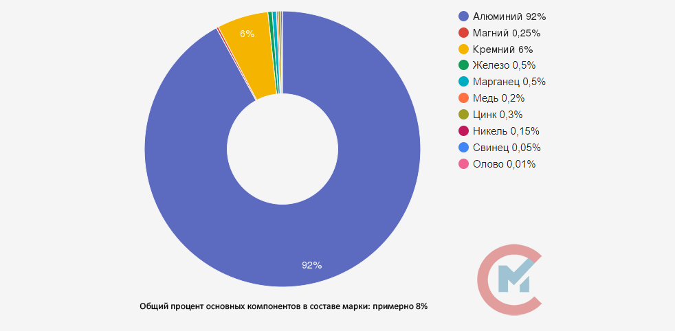 В соответствии с ГОСТ 1583-89 процентное содержание химических элементов в АЛ9: