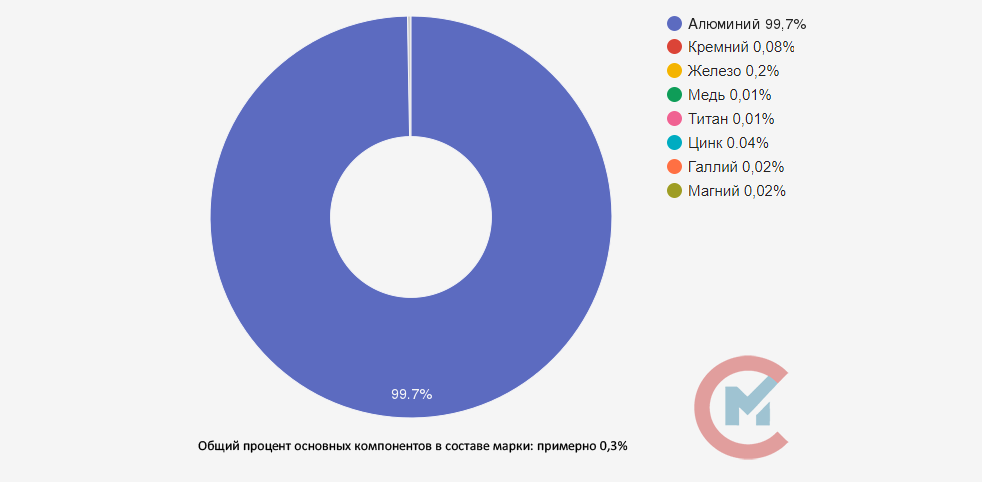 Сплав А7Е расшифровывается как: А означает основной компонент — алюминий, цифра 7 обозначает процент содержания алюминия в долях после запятой (99,7%), а буква Е — область применения (электротехнический).